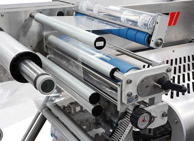 - Trois paires de rouleaux pour l' entraînement longitudinal, la soudure et le pliage du film.