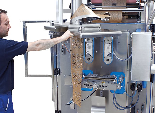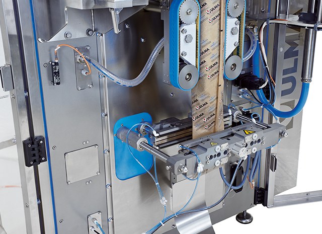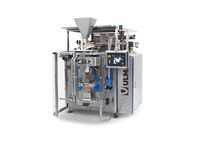 Enveloppeuse verticale (VFFS) de conception hygiénique avec changement de format facile. Conçue pour le conditionnement en continu à hautes cadences.