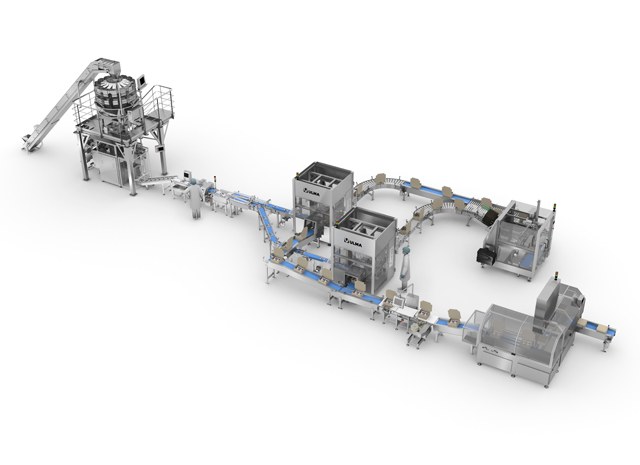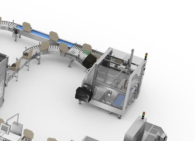 Les cellules de conditionnement sont équipées d' un robot delta et d' un système de groupement des sachets. Le robot, au moyen d' un système de vide, manipule les sachets et les place dans les caisses correspondantes. Les cellules de mise en caisse sont polyvalentes, car elles peuvent travailler avec les différentes références du client et réaliser différentes mosaïques de mise en caisse.