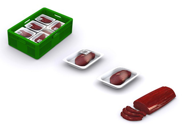 Le premier élément de la ligne est une machine à trancher la viande qui fabrique les filets qui seront ensuite chargés dans les barquettes du convoyeur d' alimentation de l' operculeuse.