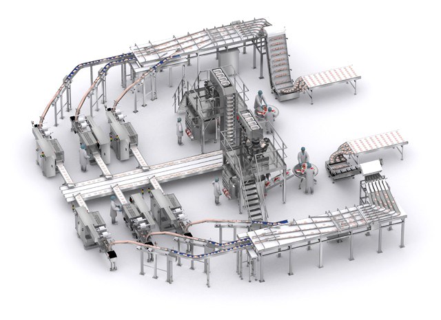 L' installation comprend un système de transport et de distribution de steaks hachés surgelés. Le produit reçu est distribué aux différentes lignes d' emballage individuelles au moyen de rampes et de guides d' alignement.