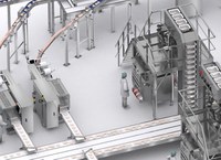 Les emballages préalablement fabriqués à l' unité sont déposés sur un tapis qui amène à un système d' élévation pour alimenter les multi-têtes qui à leur tour alimentent les ensacheuses verticales qui réalisent les sachets en multipack.