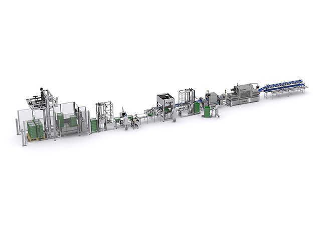 La ligne d' emballage dispose d' un dépileur automatique de caisses vides pour alimenter la cellule de mise en caisse robotisée.