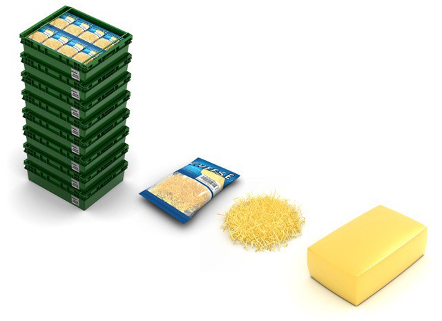 La ligne de conditionnement débute par une râpeuse à fromage. Le produit est recueilli sur un tapis qui lit automatiquement le flux de fromage reçu, en ajoutant un agent antiagglomérant (généralement de la fécule de pomme de terre) en proportion adéquate par rapport à la lecture du flux de fromage reçu.