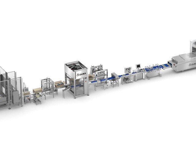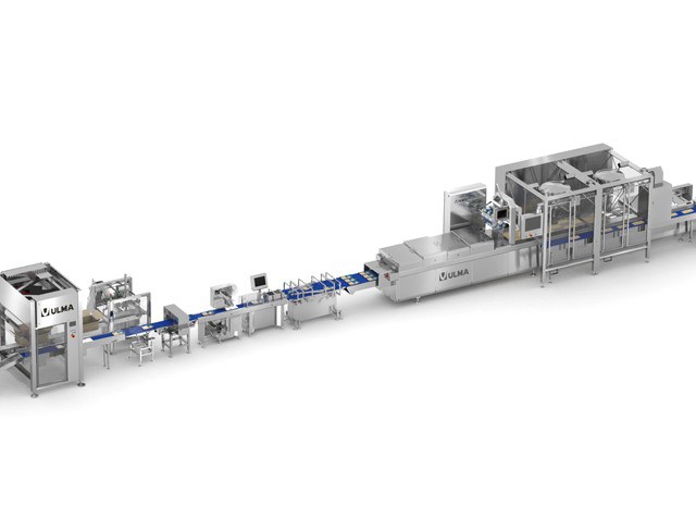 La ligne débute par une trancheuse automatique qui possède un magasin d' accumulation du produit pour approvisionner la cellule de chargement robotisée qui se compose de deux robots qui alimentent la thermoformeuse.