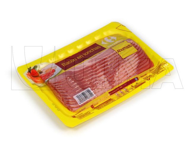 Conditionnement de bacon en thermoformage skin avec film rigide.