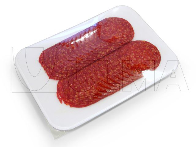 Conditionnement de Chorizo tranché en operculage sous atmosphère modifiée en barquette polystyrène plate.